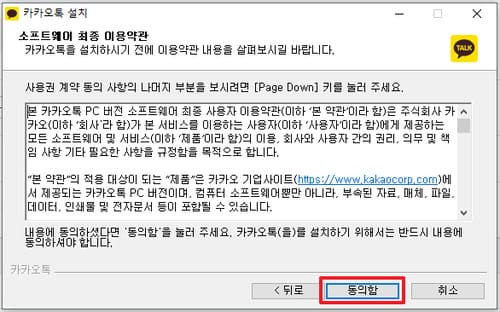 그럼 카카오톡 설치화면이 뜨는데요, 이때 다음>을 누르고 다음화면에선 동의함을 눌러줍니다.