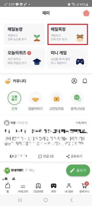 친구추가 방법을 알아볼게요. 팔도감 첫 화면 하단에 있는 재미를 누르고, 매일목장에 들어갑니다.